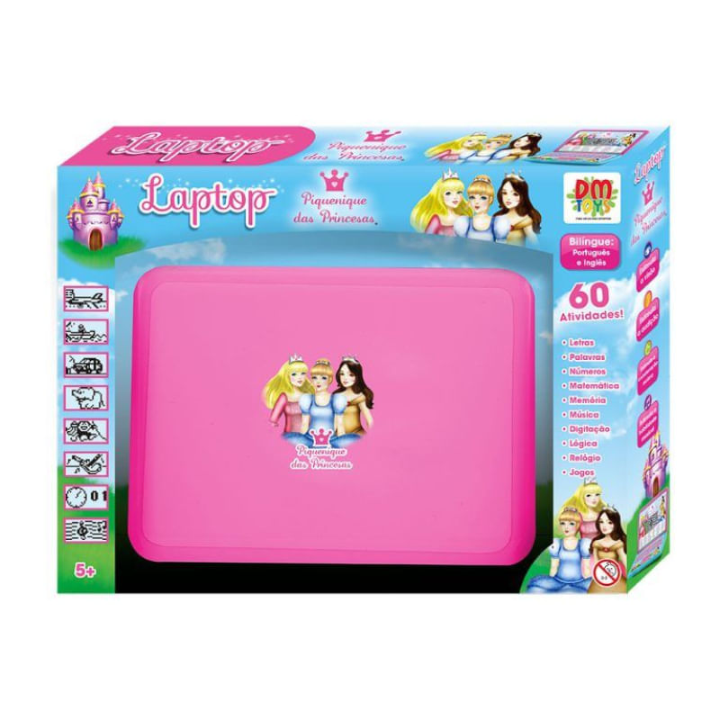 O Brinquedo Laptop Princesas é muito divertido! Com 60 atividades com conteúdo de letras, palavras, números, matemática, memória, música, digitação, lógica, relógio e jogos. E ainda é Bilíngue: inglês e português. Características: - Conteúdo da Embalagem: 01 Laptop- Marca: DM Toys- Modelo: DMT6217- Dimensões da Embalagem: 28cm, 23cm, 5cm- Código de Barras: 7899205962175- Alimentação: 3 pilhas "AA" (não incluídas)- Certificação: INMETRO Recomendado para maiores de 5 anos. Importante: - Nossos produtos encontram-se em estoque- Todos os produtos são lacrados- Produtos acompanham nota-fiscal e garantia
