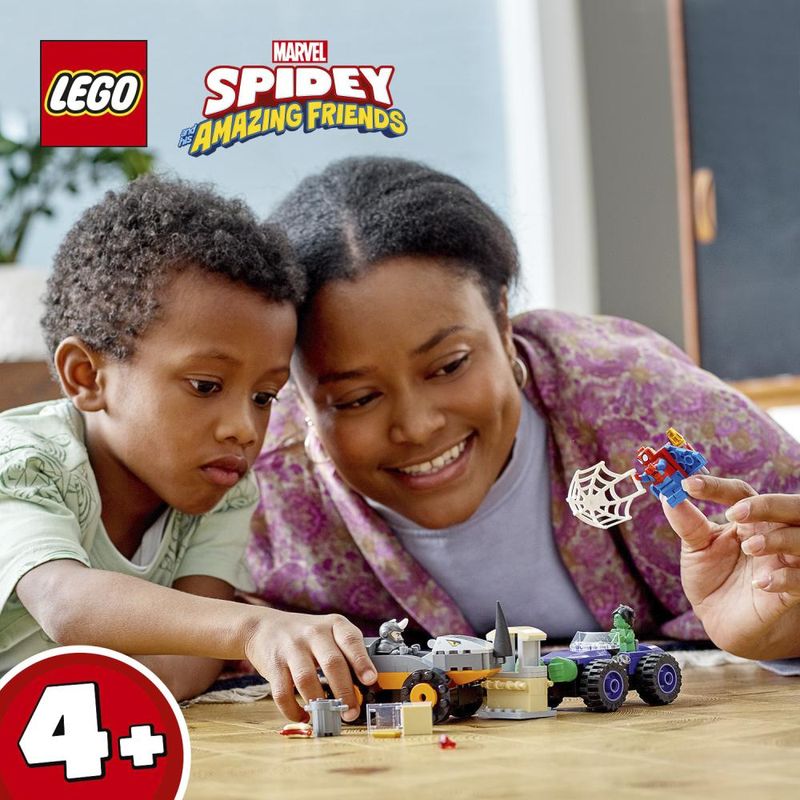 O brinquedo de construção LEGO Marvel Homem-Aranha e seus Incríveis Amigos: Confronto Hulk contra Rinoceronte (10782) coloca os super-heróis a partir de 4 anos ao volante, enquanto correm para salvar o dia. As crianças recriam cenas inspiradas pela popular série de TV do canal Disney+ enquanto ajudam o Homem-Aranha e Hulk a impedir que Rinoceronte assalte o banco. As crianças vão adorar os carros de combate neste conjunto de brinquedo para construir colecionável. Cada um dos veículos gigantes exibe detalhes incríveis – o caminhão do rinoceronte tem um chifre para forçar, enquanto que Hulk tem um par de punhos enormes prontos para combate esmagador. Torne a construção mais fácil Os conjuntos 4+ fazem as crianças construir com rapidez. Este traz 2 bases de caminhão, assim as crianças podem começar a brincar rapidamente. Elas não têm mesmo que completar o modelo antes da brincadeira começar, porque cada embalagem de peças contém um modelo e uma personagem. Os guias ilustrados simples tornam a construção fácil, até mesmo para as crianças que ainda não sabem ler. Os adultos também podem juntar-se à diversão, passando seu know-how de construção para ajudar os pequenos fãs do Homem-Aranha a se tornarem mestres construtores
