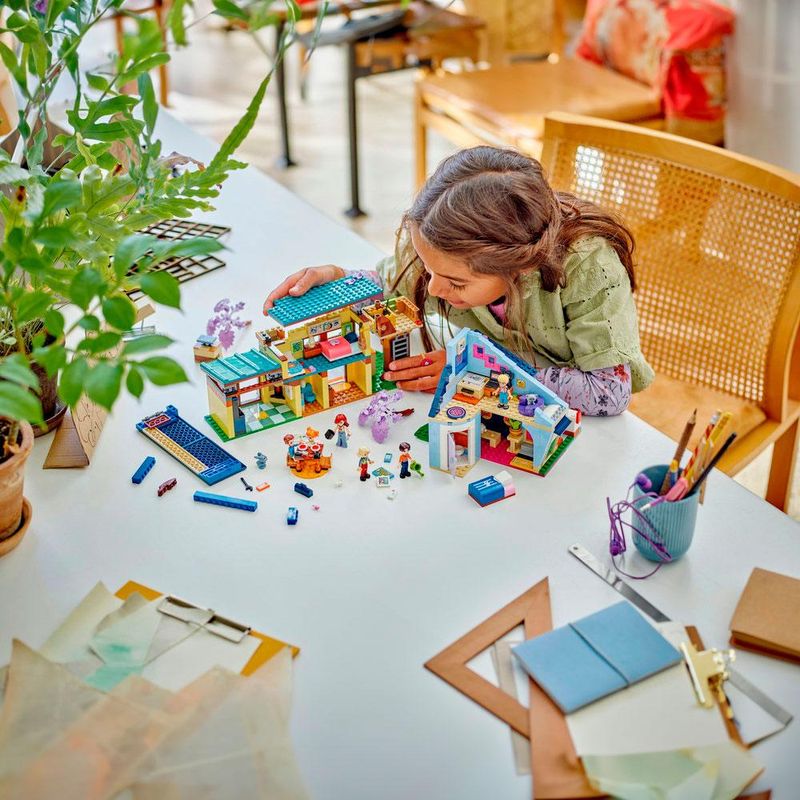 Brincadeiras criativas são muito divertidas com este conjunto LEGO® Friends Casas de Família de Olly e Paisley (42620) para crianças maiores de 7 anos. O conjunto da casas de família permite que crianças explorem a amizade entre os vizinhos Olly e Paisley, e conta com 5 minibonecos, uma microboneca, 2 figuras de animais de estimação e acessórios.Este brinquedo de construção de casinha inclui as casas de dois andares de Olly e Paisley, além de uma casa da árvore entre elas. Na casa do Olly há uma sala de estar aconchegante com acessórios para servir um chá da tarde, além de um banheiro no andar de baixo. No quarto do Olly há uma cama e pote de ração para seu gato, além de uma mesa de cabeceira e a coleção de desenhos de moda do Olly.A casa da Paisley conta com uma cozinha de família com uma mesa de jantar, fogão e geladeira com acessórios de comida. No andar de cima há o quarto que a Paisley compartilha com sua irmã mais nova. Aqui é onde ela mantém seu violão e fotos de seus amigos. Este conjunto é uma ideia criativa de presente para crianças que adoram brinquedos de diversão em família e faz de conta.