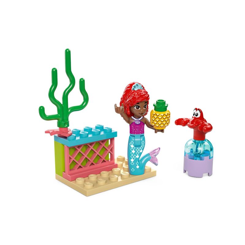 - Este brinquedo de construção infantil inclui uma miniboneca LEGO Disney Ariel e uma figura de animal LEGO.