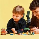 Com pranchas de surfe no teto e caixa térmica no porta-malas. Remova o teto para acessar o interior e colocar as personagens. As crianças podem colocar a cauda de sereia na minifigura.