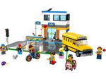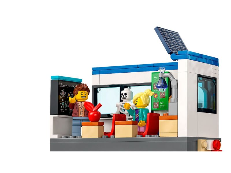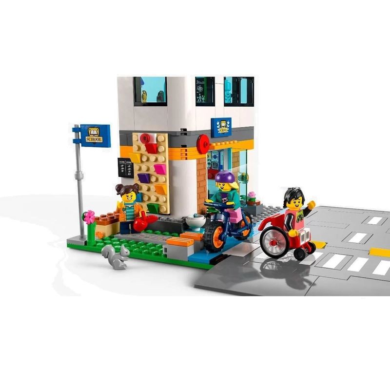 LEGO® City Dia Letivo; inclui 2 salas de aula e um pátio de escola com parede de escalada e jogo da amarelinha, e também um ônibus escolar e bicicleta para brincar. As placas de estrada com faixa de pedestre e ciclovia também podem ser usadas para conectar a outros conjuntos LEGO, e com 7 minifiguras incluindo 2 personagens da série de TV LEGO City Aventuras na Cidade, tem muita inspiração para brincadeira imaginativa.