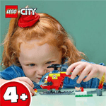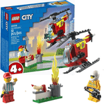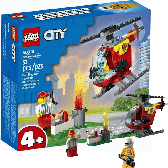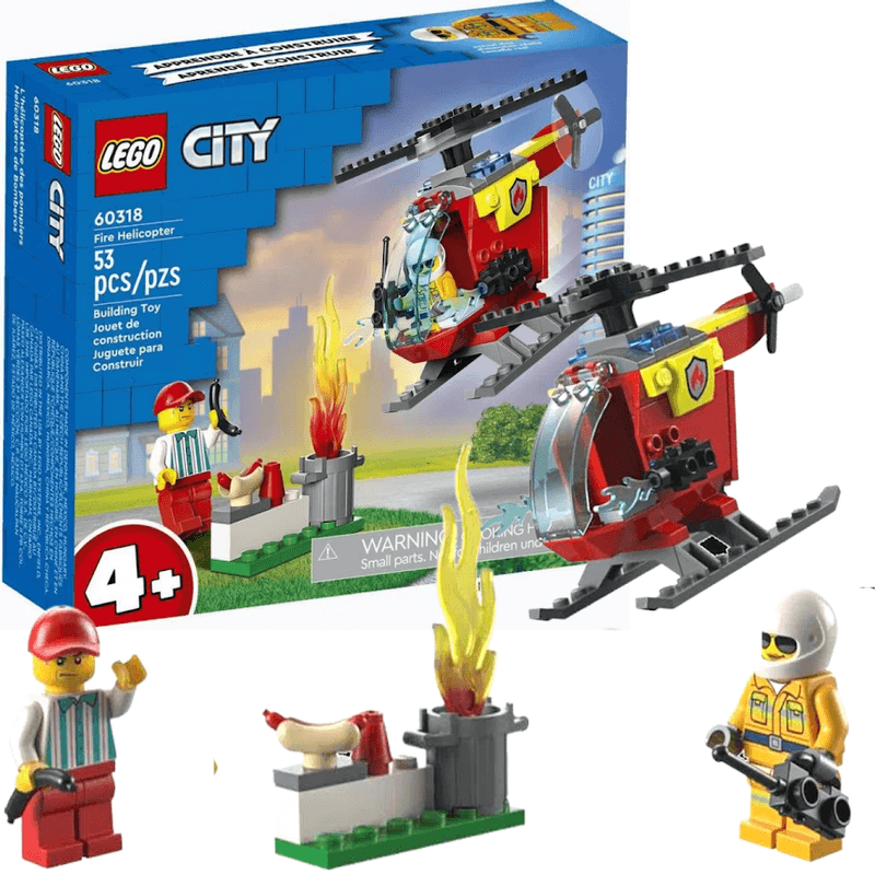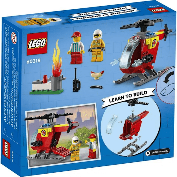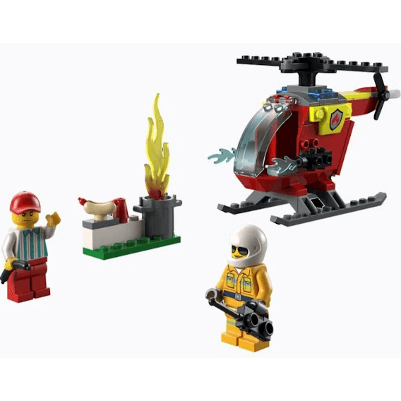 O que está na caixa? Tudo o que você precisa para construir o brinquedo helicóptero dos bombeiros, e também minifiguras de bombeiro e vendedor, uma lata de lixo com chamas LEGO e acessórios divertidos, incluindo um cachorro quente queimado.