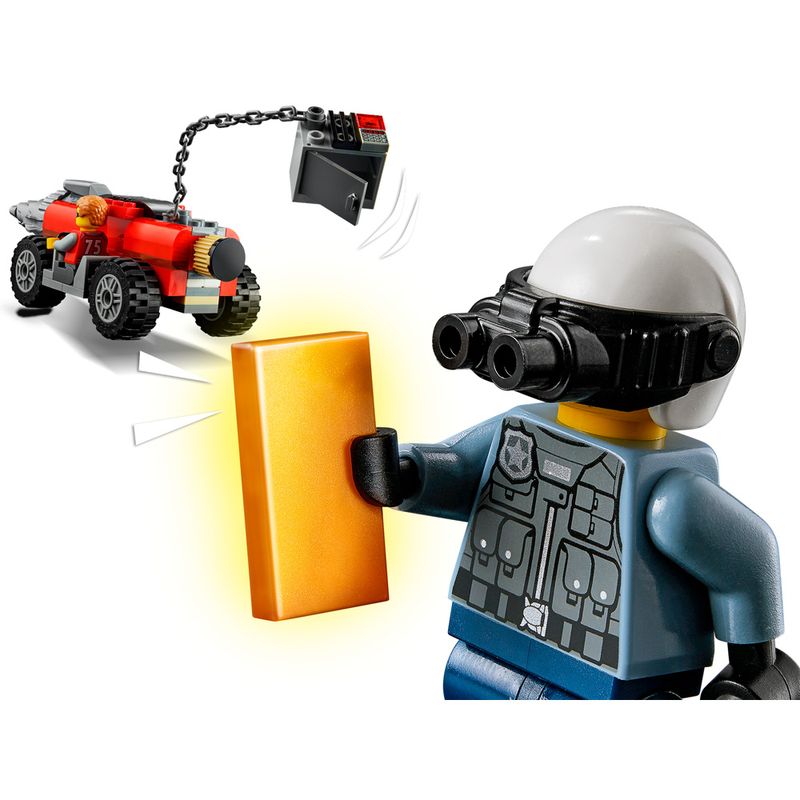 Eita! O perigoso ladrão Hacksaw Hank abriu uma passagem para entrar no banco da LEGO® City com seu potente carro perfurador de minas e fugiu durante a noite com um cofre cheio de barras de ouro! Pegue os óculos de visão noturna e vá perseguir o herói de TV da LEGO City Sam Grizzled em seu espetacular carro da polícia blindado. Diverta-se na realidade com aventuras LEGO City da série de ação de TV com este espantoso conjunto de jogo da Polícia de Elite!