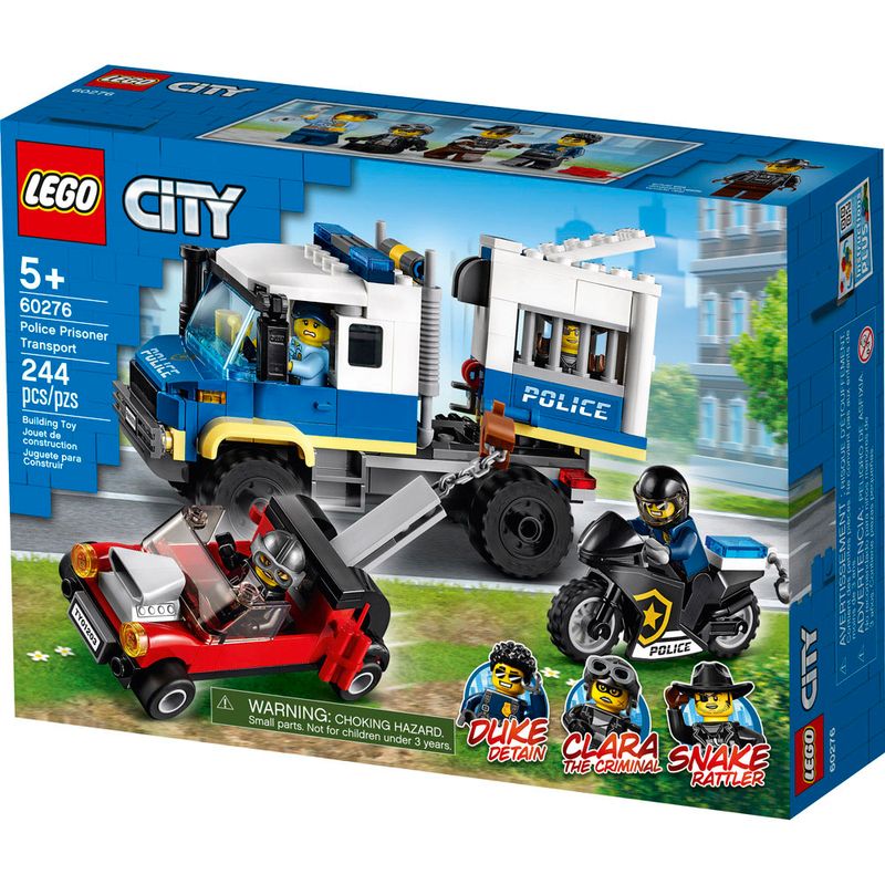 LEGO® City Transporte de Prisioneiros da Polícia (60276) traz personagens da série de Aventuras LEGO City da TV. As crianças podem recriar cenas e criar histórias com o policial herói Duke DeTain e os ladrões Snake Rattler e a criminosa Clara. Um caminhão de transporte de prisioneiros com função de fuga da prisão, reboque tunado dos ladrões e motocicleta preta ilustram a ação explosiva.