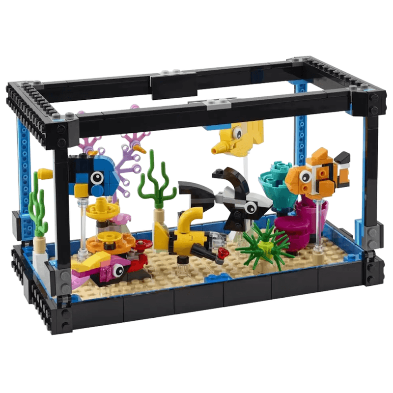 As crianças podem mergulhar em suas próprias aventuras subaquáticas com este brinquedo para construir LEGO® Creator 3em1 Aquário (31122). O aquário sem vidro ostenta 5 peixes em tons vibrantes: um peixe-palhaço, um peixe-cirurgião azul, um peixe-cirurgião amarelo, um peixe cardinal e um peixe anthias, como também um mini submarino, coral e uma planta aquática.