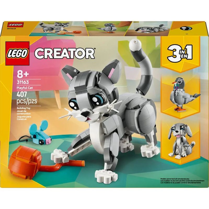 Presenteie maiores de 8 anos apaixonados por animais de estimação com este adorável conjunto de construção LEGO Creator Gato Brincalhão 3em1 (31163). O conjunto de pet contém um gato fofo com cabeça, orelhas, cauda e pernas articuláveis, e os acessórios incluem uma tigela de comida, rato de brinquedo e um novelo de lã que as crianças podem usar para viver histórias divertidas. Meninas e meninos podem construir três conjuntos de animais LEGO diferentes com as mesmas peças: um gato articulável que pode sentar, ficar de pé e dar um bote; um cachorro articulável adorável com um osso; e um pombo com migalhas de pão. As três cenas tornam este um ótimo presente LEGO que as crianças podem expor e usar para desfrutar de brincadeiras imaginativas. Os conjuntos LEGO Creator 3em1 inspiram a imaginação das crianças com três modelos diferentes para construir em cada caixa. Elas podem se animar para construir, reconstruir e construir novamente. Os conjuntos 3em1 oferecem uma linha que apela às maiores paixões das crianças, incluindo veículos supervelozes, animais incríveis e casas detalhadas. Tenha em mente que os modelos não podem ser construídos simultaneamente.