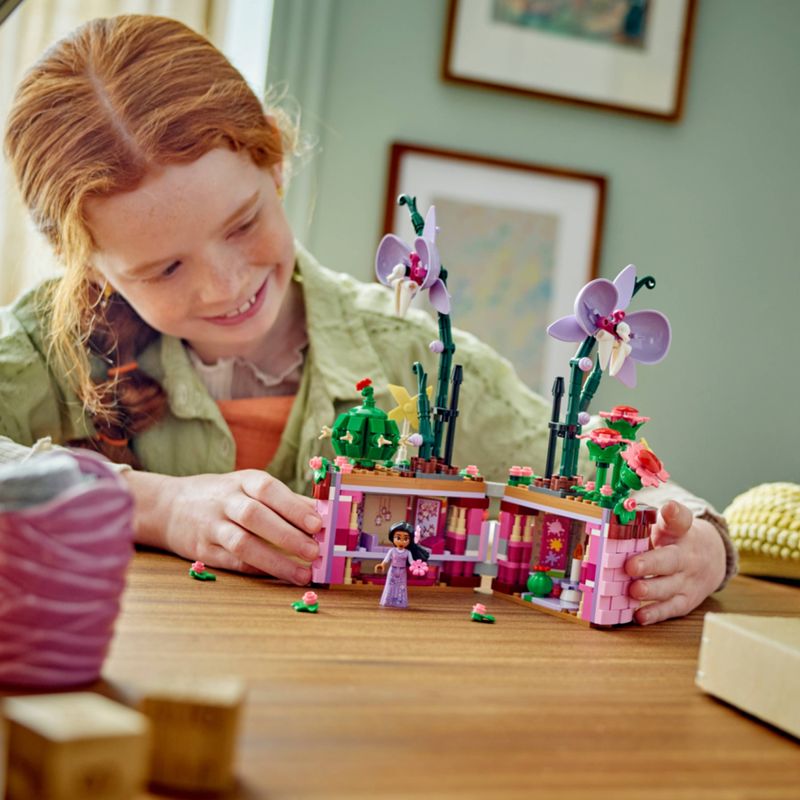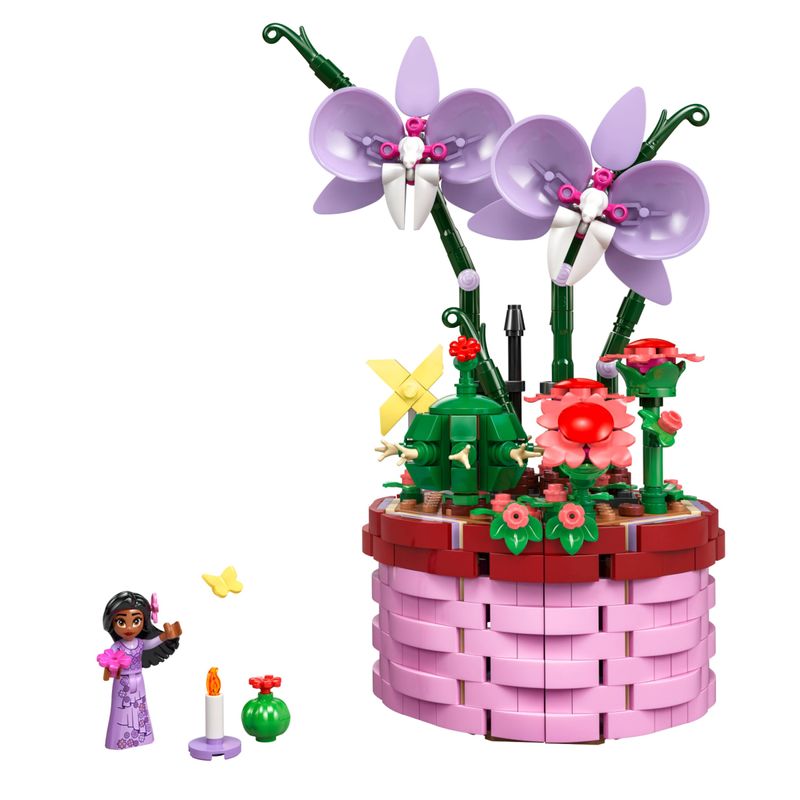 Possibilidades criativas – O conjunto para construir inclui um vaso de abertura com desenho de cesta inspirado no filme, flores e uma miniboneca Isabela LEGO® | Disney Encanto
