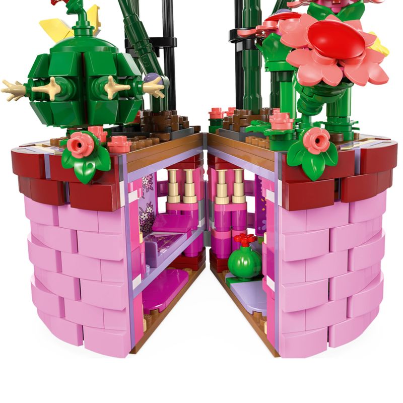 Espaço escondido – Dentro do vaso há uma configuração detalhada do quarto da Isabela, com cama, cactos e orquídeas LEGO®, mais iniciadores de brincadeira e espaço para a figura da miniboneca
