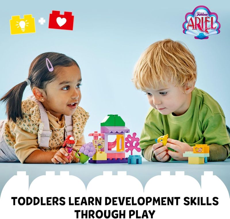 Este conjunto de construção educacional também ajuda a desenvolver o pensamento lógico enquanto as crianças montam peças fáceis de manusear para recriar cenas do programa de TV. Brinquedo de construção para fãs da Pequena Sereia a partir de 2 anos – LEGO® DUPLO® | Disney Ariel e Flounder's Café Stand brinquedo de construção com elementos de frutas para brincadeiras divertidas de comida para crianças pequenas 2 personagens familiares – Este brinquedo de construção para crianças em idade pré-escolar vem com 2 figuras LEGO® DUPLO®: Ariel e Linguado do programa de TV Disney Junior Ariel Brinquedo de construção educativo para crianças em idade pré-escolar – As crianças aprendem os nomes das frutas enquanto se imaginam pedindo smoothies e saindo com os amigos neste colorido café subaquático Desenvolve destreza - Este brinquedo de construir e reconstruir foi habilmente projetado para ajudar as crianças a aprimorar suas habilidades motoras finas, classificação de cores e coordenação olho-mão enquanto montam os tijolos fáceis de manusear Um presente para os pequenos fãs da Disney – Esta é uma ideia divertida de presente a qualquer hora para crianças a partir de 2 anos que amam o programa de TV Disney Junior Ariel Conjuntos de construção de qualidade – os conjuntos de construção LEGO® DUPLO® utilizam tijolos e elementos que foram testados ao máximo para garantir que cumprem os exigentes padrões de segurança infantil Brinquedo de aprendizagem infantil para crianças em idade pré-escolar