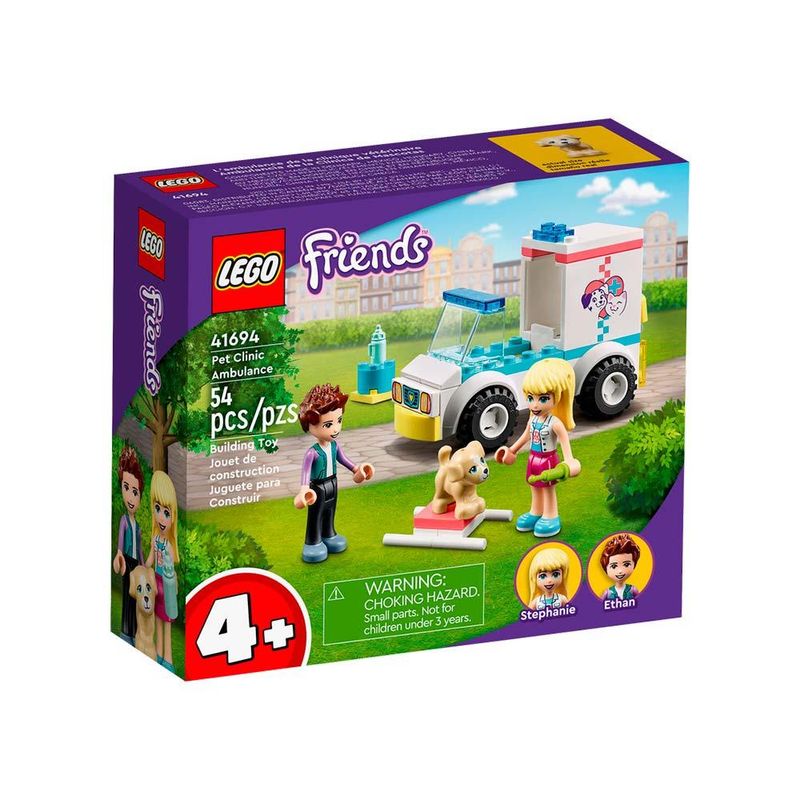 Lego Friends - Ambulancia Veterinaria - 54 Pecas - Lego: Ajude as criancas a partir de 4 anos a desenvolver suas habilidades de construcao enquanto brincam de heroi com o brinquedo LEGO Friends Ambulancia da Clinica Veterinaria (41694). As criancas vem resgatar o pobre cachorrinho e aprendem que os amigos estao sempre la para ajudar. Elas vao adorar dirigir a linda ambulancia, com sua porta traseira articulada, maca e acessorios para alimentacao animal. Da uma olhadinha nesses diferenciais: - Pratico, intuitivo e divertido - Visual unico, criado para passar harmonia e felicidade, mostrando a lindeza da Amizade - Blocos classicos, nostalgicos e inovadores para representar a diversao unica de brincar com Lego - Garante a brincadeira e desenvolvimento criativo, percepcao visual, coordenacao motora, concentracao, e facilita no reconhecimento de cores e formas Informacoes: • Produto: Lego Friends Ambulancia da Clinica Veterinaria • Marca: Lego • Colecao: Lego Friends • Tipo: Blocos de Montar • Conteudo: 54 pecas e manual de instrucoes • Compativel: blocos compativeis com outras marcas (Cubic, Multikids, BricTek e Sluban) • Recomendacao: para criancas a partir de 04 anos de idade Especificacoes: • Referencia: 41694 • Codigo de Barras: 673419351881 • Embalagem (C x A x L): 13,5 x 12 x 04 cm • Embalagem (Peso): 0.110 kg • Registro: 005 828/2021 • Certificado: Orgaos Autorizados - OCP´S (Organismos de Certificacao de Produtos) BENEFICIOS DE BRINCAR: - Eleva a autoestima - Exercita a memoria - Estimula o raciocinio - Exercita o imaginario - Desenvolve a criatividade - Desenvolve percepcao visual - Desperta a atencao e curiosidade - Desenvolvimento neuropsicologico - Estimula habilidades motoras basicas - Incentiva a comunicacao e linguagem - Desenvolve aspectos emocionais e afetivo - Estimula o reconhecimento de formas e cores Aviso: - As imagens sao meramente ilustrativas - Os tamanhos e medidas sao aproximados - As cores e estampas dos produtos podem ter variacoes - As informacoes sao de responsabilidade do fabricante ou fornecedor