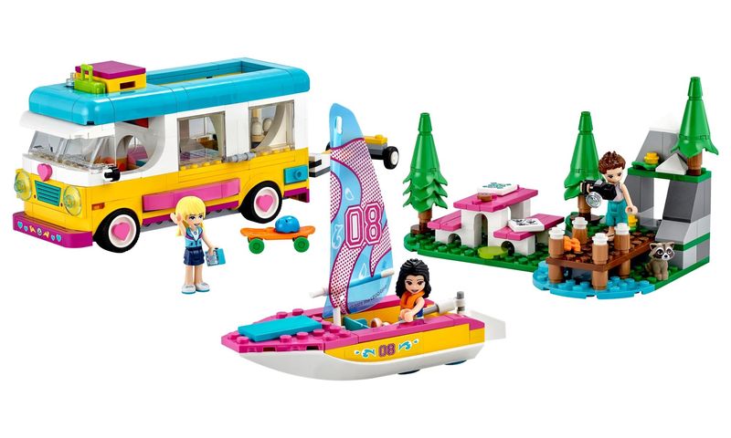 Este trailer colorido está cheio de detalhes para as crianças explorarem e tem um bagageiro com muitos acessórios. O teto dianteiro é removível para fácil acesso à cabine, e o teto principal é articulado; assim as crianças podem facilmente remover os sacos de dormir para um acampamento ao ar livre. O barco LEGO inclui um leme e vela móvel para aventuras de vela e há um lindo cenário de lago e montanha onde as crianças podem estacionar para explorar o campo. Também há um brinquedo guaxinim para os mais novos fazerem amizade.