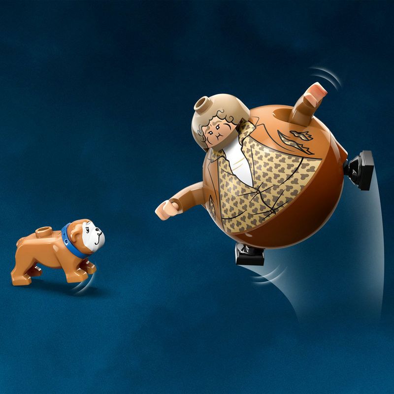 Um brinquedo mágico para o fim de ano ou aniversário de meninos, meninas e fãs maiores de 8 anos, este conjunto de aventura de fantasia inclui cinco minifiguras LEGO Harry Potter e uma figura do cão Estripador. Também inclui uma figura inflada da tia Guida para recriar a cena hilária em que Harry lança um feitiço para enchê-la como um balão, além de uma construção lateral com a placa “Rua dos Alfeneiros” e um poste de luz.