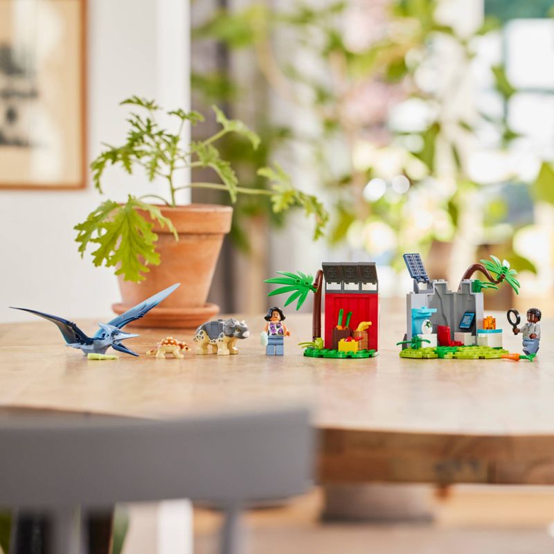 Centro de pesquisa de dinossauros – As 5 figuras de brinquedo de dinossauro incluem um bebê Ankylosaurus, Triceratops e Velociraptor, um pequeno Velociraptor e um Pteranodon adulto, além de minifiguras de Darius e Sammy