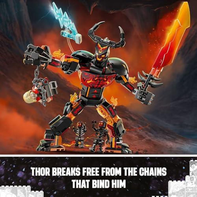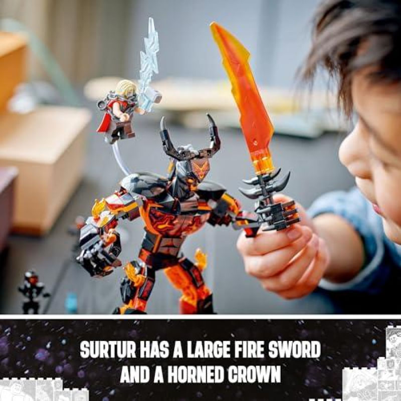 Desperte o herói que existe em você com o conjunto de LEGO Marvel Thor vs. Surtur (76289)! Baseado na emocionante cena do filme Thor: Ragnarok, este brinquedo proporciona uma diversão sem limites. Com três minifiguras, incluindo o poderoso Thor e dois guerreiros de fogo, as aventuras começam assim que as peças se juntam. Os principais benefícios incluem: - **Personagens icônicos**: Recrie momentos memoráveis com Thor e Surtur. - **Construção articulada**: A figura de Surtur pode ser posicionada em diferentes poses, trazendo a batalha à vida. - **Brincadeiras imaginativas**: Um conector transparente faz parecer que Thor está voando sobre o gigante. - **Experiência digital envolvente**: Utilize o aplicativo LEGO Builder para ampliar e girar modelos em 3D, tornando a construção ainda mais divertida. - **Ideal para fãs de Marvel**: Um presente perfeito para jovens super-heróis a partir de 8 anos. Com 245 peças, incluindo uma impressionante figura de Surtur de 18 cm, este conjunto é ideal para famílias que desejam viver grandes aventuras juntos. Não perca a chance de levar sua imaginação a um novo nível! Adquira já o seu e comece a construir histórias incríveis!