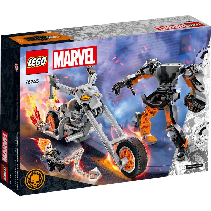 As crianças colocam a minifigura Ghost Rider LEGO no cockpit de abertura do mech Ghost Rider. O mecanismo articulado tem braços, pernas e mãos móveis, permitindo que seja posicionado e posado para possibilidades infinitas de brincar e exibir. Uma corrente acoplável inspira ação imaginativa enquanto as crianças levam o enorme mecanismo para um passeio em busca de bandidos. A moto fica na vertical sem ajuda e possui chamas de escape e um elemento de assento que garante que o mecanismo permaneça na sela quando estiver em movimento.