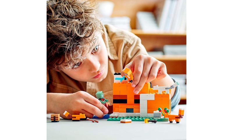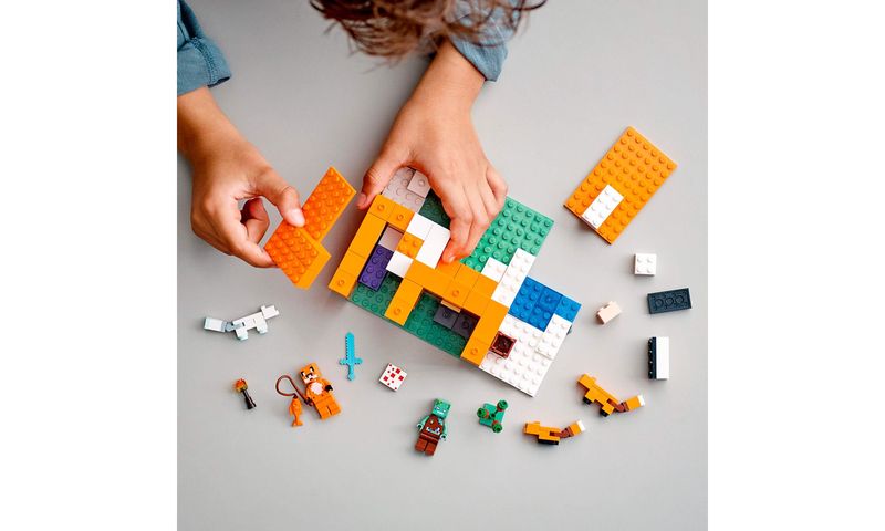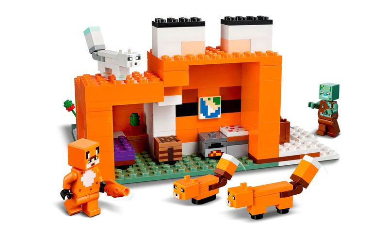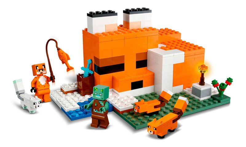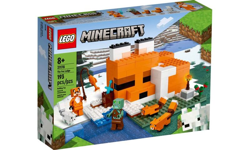 Lego Minecraft 21178 Pousada da Raposa (21178) está repleto de personagens, acessórios e recursos para inspirar brincadeiras criativas sem fim. Inclui personagens icônicos do Minecraft: um Zumbi Afogado, Raposa, Raposa do Ártico e uma figura de Herói em uma pele de raposa.
