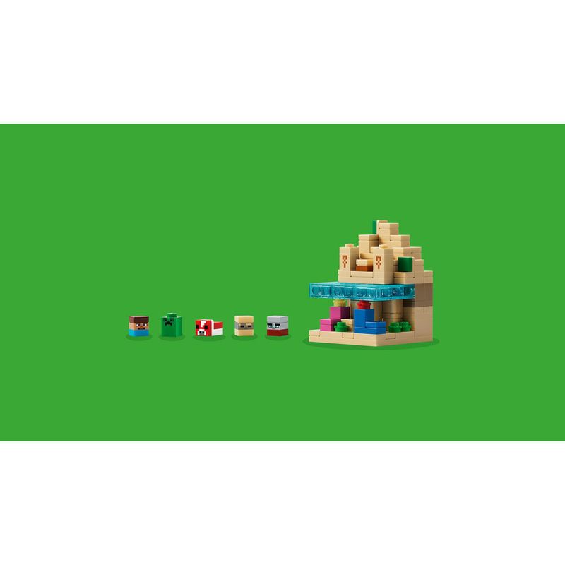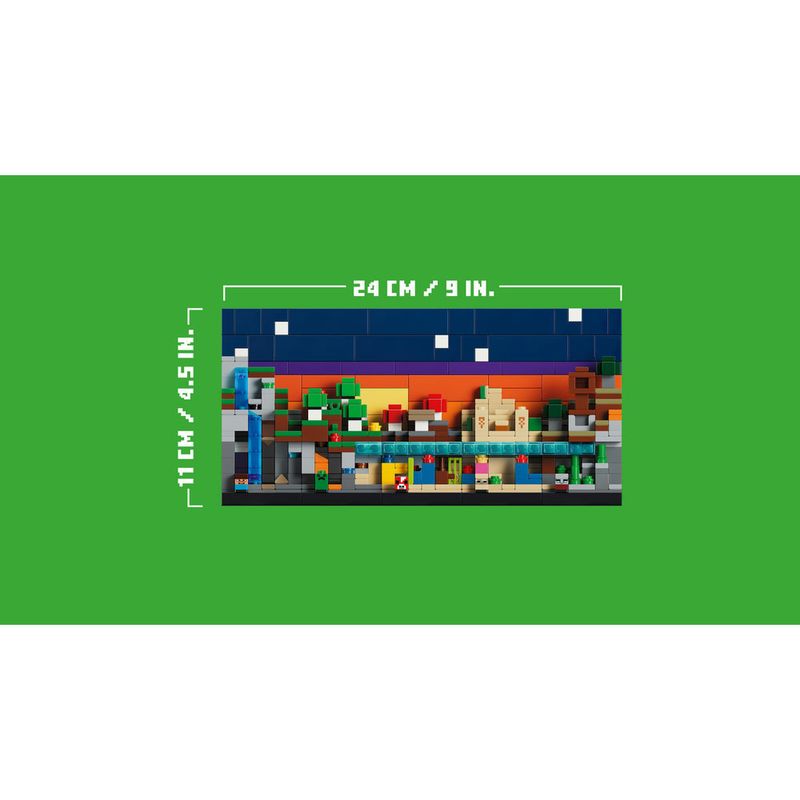 O conjunto LEGO Minecraft tem 5 biomas removíveis: montanha – com caverna de pingentes, geodo de ametista e cachoeira; floresta de flores – com uma caverna, lava e ouro; campos de cogumelos – com um recife de coral, naufrágio, 2 cogumelos vermelhos e um cogumelo marrom; deserto – com um templo, recife de coral, oceano, cacto e baú de tesouro; e savana – com um posto avançado de saqueador, caverna exuberante, árvores de acácia, abóbora, lava e praia. Também inclui um cenário reversível (dia/noite). Este conjunto é um ótimo presente de jogo para jogadores de Minecraft e fãs de LEGO. E, com o aplicativo LEGO Builder, as crianças podem construir com confiança, ampliando e girando em 3D e acompanhando o progresso com instruções digitais fáceis de seguir. O conjunto contém 797 peças.