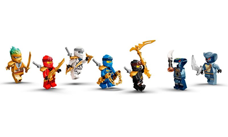 Este conjunto único inclui 7 minifiguras: os ninjas Kai, Zane, Cole e Jay e também as serpentes soldado Mezmo e Rattla da tribo Hypnobrai, dando às crianças tudo o que precisam para encenar combates emocionantes. Novidade para junho de 2021, também tem uma minifigura colecionável dourada de Zane, nunca antes vista, com um suporte para celebrar 10 anos de brinquedos NINJAGO.