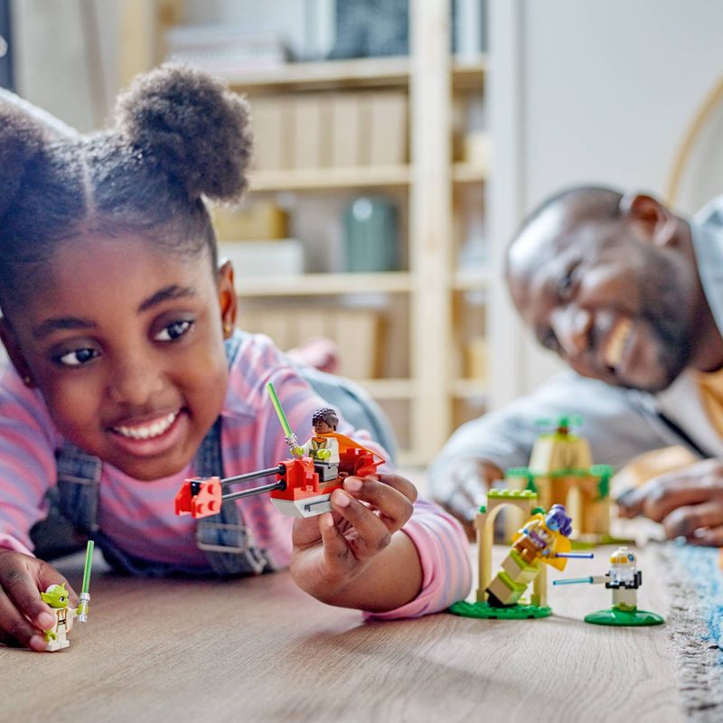 • Motocicleta speeder construível e equipamento para treinamento Jedi – A motocicleta speeder tem espaço para todas as 3 minifiguras LEGO®, e há um droide de treinamento e prova de equilíbrio para inspirar a imaginação das crianças