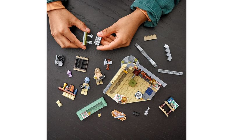 Esta recriação detalhada da incrível casa de Thor em Nova Asgard inclui 2 minifiguras – Bro Thor e Korg – um Miek para construir e muitos itens e acessórios para inspirar diversão de encenação infindável. Inclui Stormbreaker, uma console de videogame, sofá, tela de TV, caixas de pizzas.