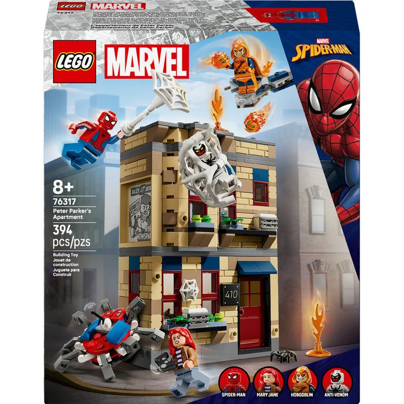 O Apartamento do Peter Parker (76317) é um item colecionável LEGO | Marvel do Homem-Aranha para fãs de brinquedos para montar, minifiguras de Super-heróis e ação explosiva. Com infinitas brincadeiras dentro e fora do apartamento, este conjunto de construção de Super-herói é um ótimo presente para crianças maiores de 8 anos. O conjunto para construir contém quatro minifiguras: O Duende Macabro em seu planador com bombas de abóbora; o Homem-Aranha e Anti-Venom que disparam teias; e a Mary Jane com um robô-aranha articulado. Uma teia gigante e flexível presa ao edifício captura uma minifigura. Há uma cozinha no primeiro andar do apartamento. O andar de cima tem um escritório e quarto com uma cama que dobra, mesa, computador, câmera e microscópio. Uma função ativada por botão causa o colapso de parte do edifício. As crianças podem conectar este conjunto para construir e brincar ao Homem-Aranha vs. Oscorp (76324) e empilhá-lo em cima do Aranhaverso: Miles Morales vs. Spot (76311) para uma experiência lúdica ainda maior. Contém 394 peças.