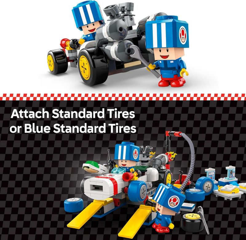 Mario Kart™ (72035). Uma fantástica ideia de presente de personagem Nintendo® para meninos, meninas e jogadores de 8 anos ou mais, o conjunto apresenta 2 figuras de brinquedo Blue Toad em uniforme de equipe de box azul, além de um elevador de carro funcional, uma escolha de pneus padrão ou pneus padrão azuis e ferramentas. O B Dasher tem um disparador de projéteis, e os construtores também podem anexar a buzina e o motor das máquinas de personalização. Adicione uma figura LEGO® Mario™, LEGO® Luigi™ ou LEGO® Peach™ (dos conjuntos 71439, 71440 ou 71441 – vendidos separadamente) para jogo interativo, incluindo reações digitais ao dirigir, derrapar e pairar no B Dasher, e selecionar sons de buzina e motor nas Máquinas de Personalização. Encontre instruções de construção para este conjunto colecionável da Nintendo na caixa ou no aplicativo LEGO Super Mario e confira outros conjuntos LEGO Super Mario: Mario Kart (vendidos separadamente). Ideia de presente de personagem Nintendo® – Deixe as crianças brincarem de ser a equipe de box preparando um kart B Dasher para a ação de corrida na garagem do Toad com este conjunto de brinquedo personalizável LEGO® Super Mario™: Mario Kart™ 2 figuras de brinquedo colecionáveis ??Nintendo® Blue Toad (Pit Crew)
