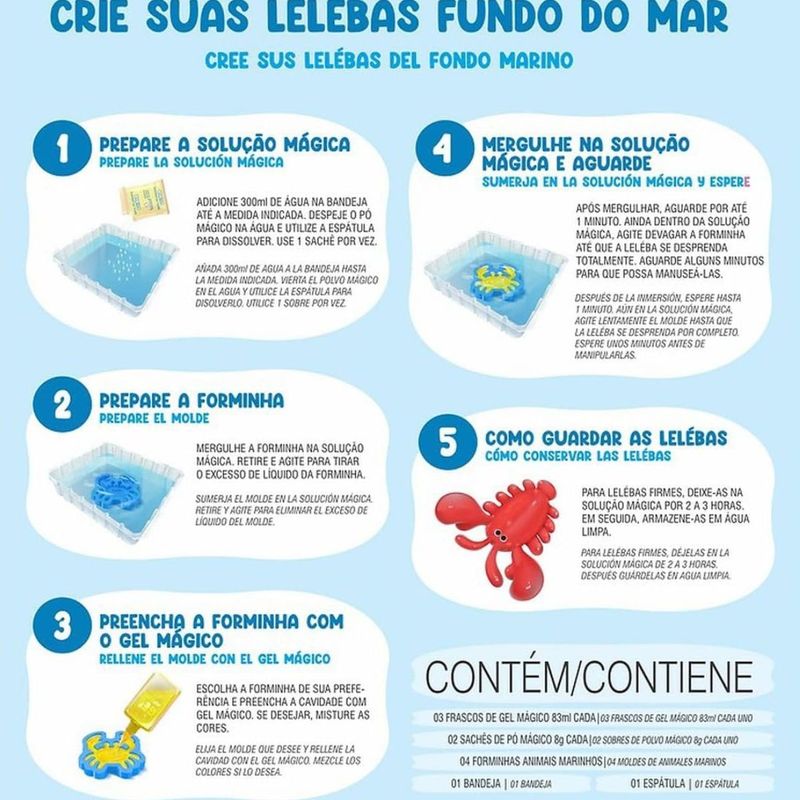 4- Para conservar as Lelebas, mantenha-as na solução mágica por 2 a 3 horas e depois armazene em água limpa. Este processo proporciona horas de entretenimento criativo e encantador, levando as crianças a um mundo subaquático de imaginação e diversão com o Gelelé Leleba Gel Mágico Fundo do Mar!