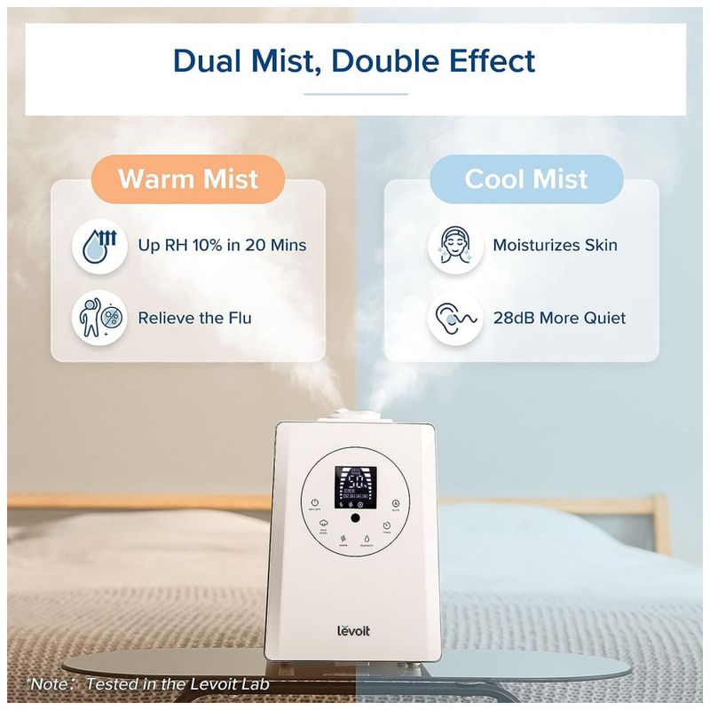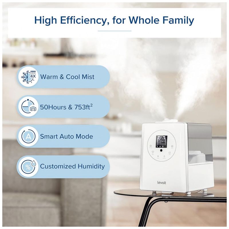 Perfeito para salas grandes com uma saída de névoa de até 500 mL , h, o LV600HH pode facilmente lidar com espaços tão grandes quanto 753 pés2 , 70 m2. A grande capacidade de 1,5 gal , 6 L permite 60 horas de uso contínuo com baixo nível de névoa.