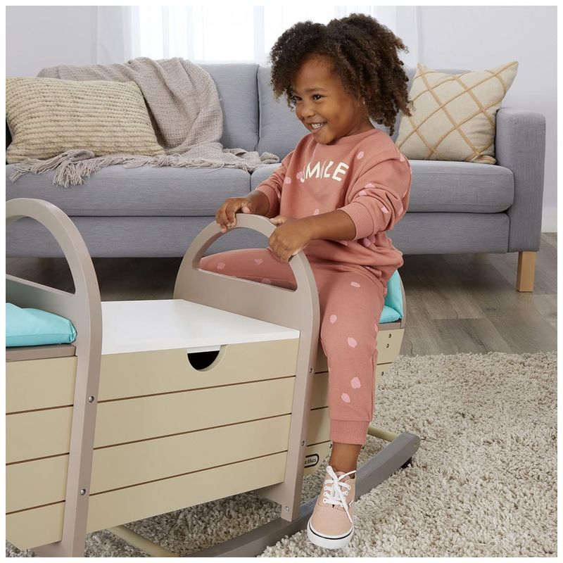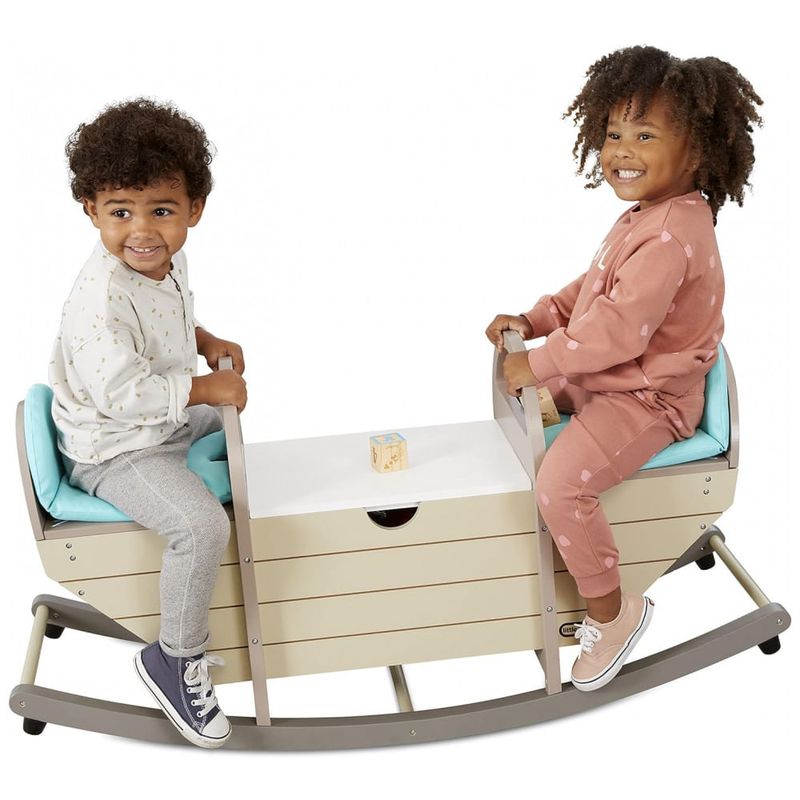 DIVERTIDO E CONFORTÁVEL Com almofadas de assento de tecido e suporte para as costas, os pequenos vão balançar e cambalear para o conteúdo de seus corações.