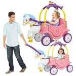 Inclui tábua de chão para proteger os pés dos mais pequenos, tábua de chão amovível e a criança pode tomar as rédeas e conduzir sozinha, som de trote de cavalo, porta copos pai e filho, consola dos pais no tejadilho