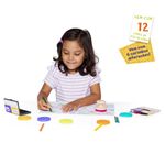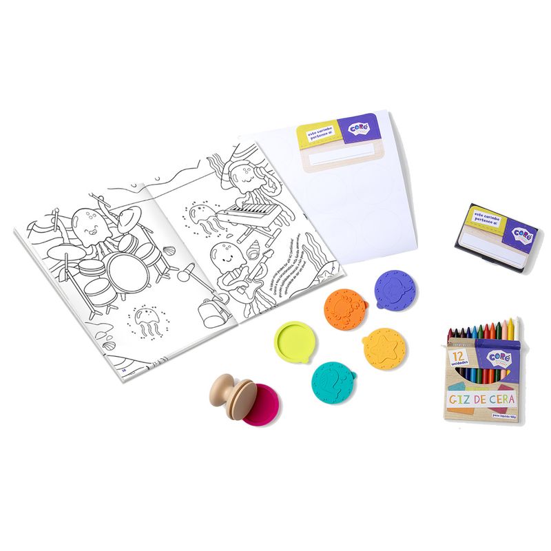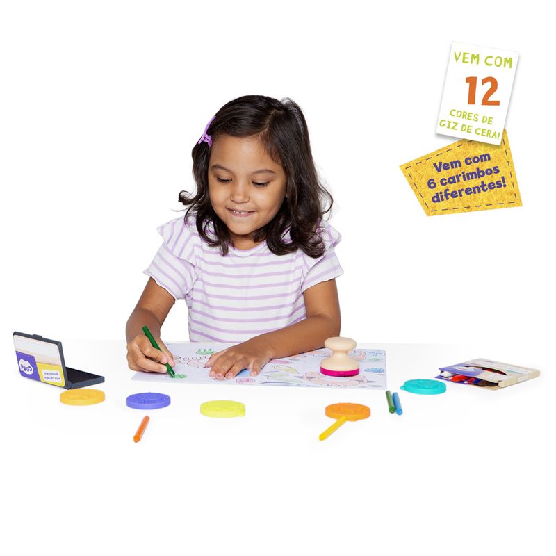 Material: 1 suporte de carimbos, 6 carimbos, 1 almofada de tinta, 1 caixa de giz de cera com 12 cores e um livro com 20 páginas