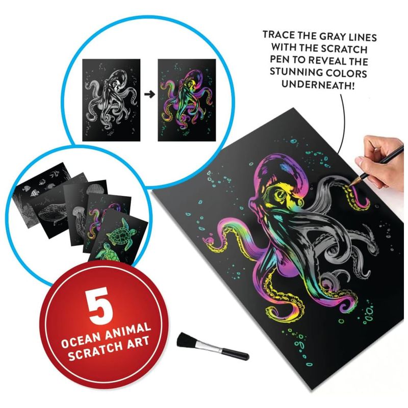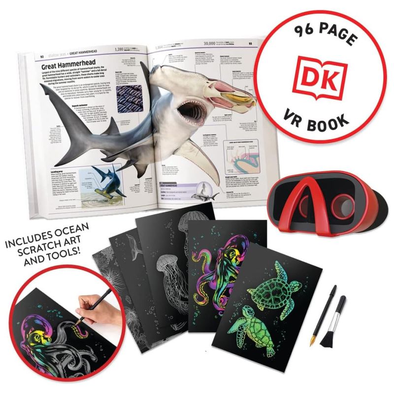 O QUE ESTÁ NA CAIXA Este conjunto de presente de luxo inclui um livro interativo de 96 páginas, com um conjunto de scratch art colecionáveis para criar sua própria arte vibrante de animais marinhos, junto com um par de óculos VR Inclui um par de óculos viva voz para criar uma experiência de aprendizagem envolvente. Compatível com todos os smartphones com acesso à Google Play Store e à Apple iOS App Store.