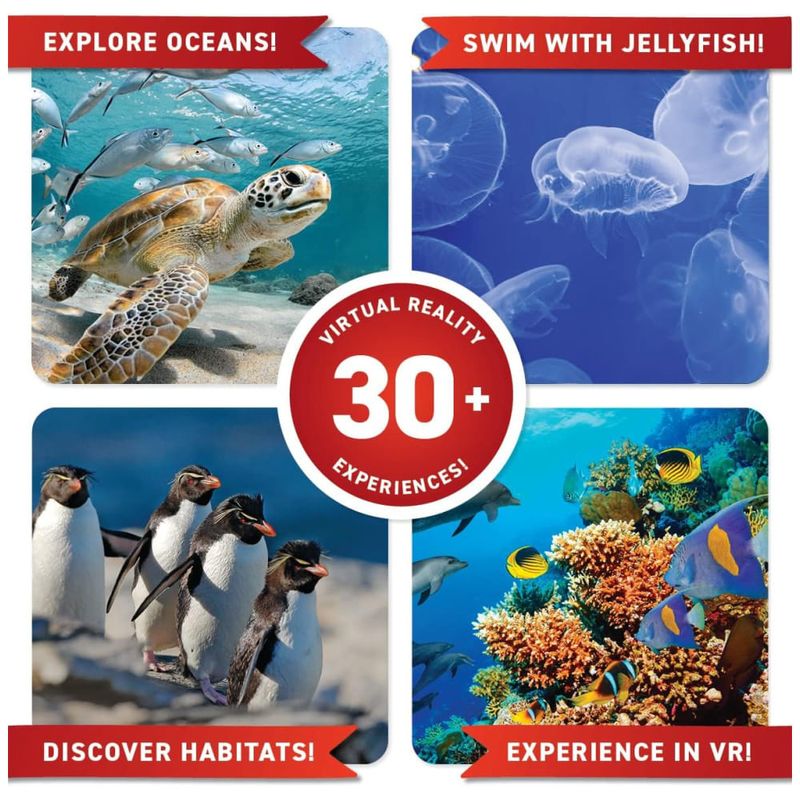 DESCUBRA A BELEZA DO FUNDO DO MAR Com mais de 96 páginas de conteúdo interativo, este conjunto de presente é a melhor experiência para os amantes da vida marinha. Explore a complexidade das criaturas oceânicas em uma impressionante realidade virtual com mais de 30 experiências imersivas em VR. Nade com grandes tubarões brancos, águas vivas, baleias, golfinhos, pinguins e muito mais