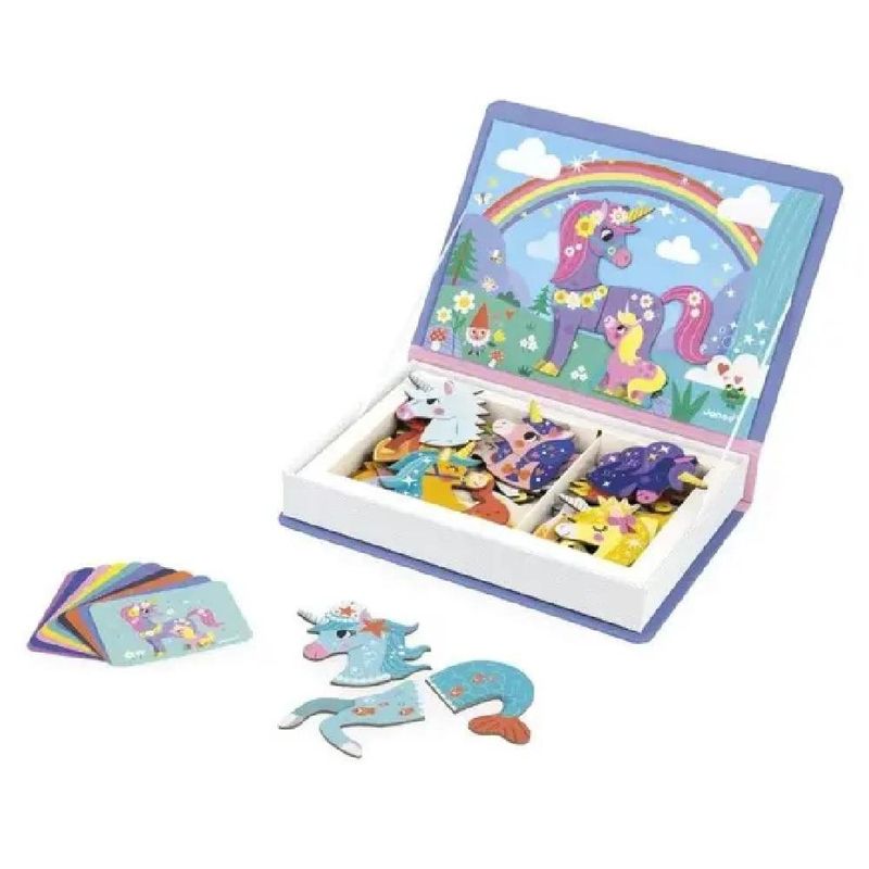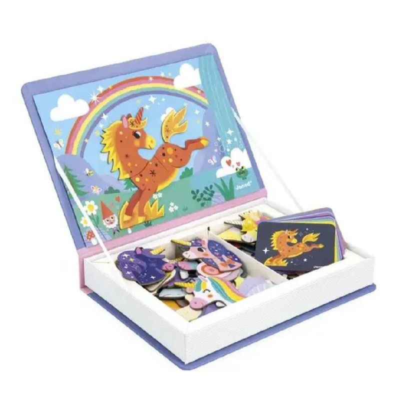 O Magneti'Book Unicórnio é um convite para um mundo mágico cheio de cores e fantasia! Com 44 peças magnéticas e 10 cartões, as crianças podem recriar as cenas sugeridas ou soltar a imaginação para criar suas próprias combinações encantadas. Esse brinquedo educativo desenvolve a criatividade, o raciocínio lógico e a coordenação motora, garantindo momentos de diversão em casa ou durante viagens. Qual história mágica você vai inventar hoje?
