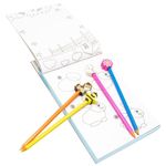 Acabamento: Brochura com kit contendo 4 lápis de cor e borracha