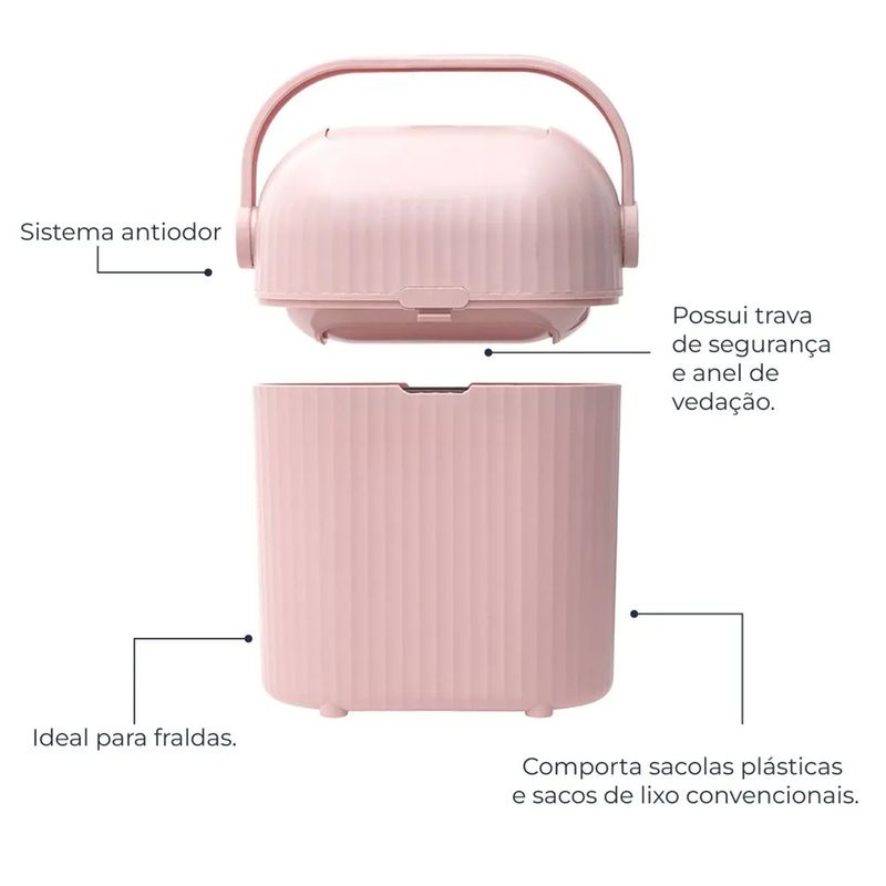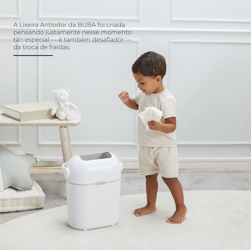 A lixeira anti-odor é perfeita para o descarte das fraldas do dia a dia do seu bebê, permitindo com que o mau cheiro não se espalhe pela casa! Possui reservatório com capacidade de 9 litros, é fácil desmontar para o descarte do lixo, possui tampa com cápsula giratória, anel de vedação anti-odores e suporte para sacos plásticos com trava. Sabemos que praticidade e higiene são pontos importantes para o dia a dia de qualquer papai e mamãe que possuem bebês em casa. Foi pensando nisso que a Buba desenvolveu o Lixeira que pode ser usado com apenas uma mão e irá auxiliar o descarte de fraldas de maneira rápida e fácil! Ele pode ser usado com sacos de lixos convencionais, de 10L, possui sistema patenteado de fechamento e o inovador sistema de vedação que impede que o cheiro das fraldas sujas se prolifere no ambiente, garantindo conforto e higiene. Além disso, apresenta grande armazenamento por conta do seu tamanho robusto, material resistente de polipropileno sem bisfenol e design moderno. Medidas: 36 x 30 x 20 (AxLxP) cm