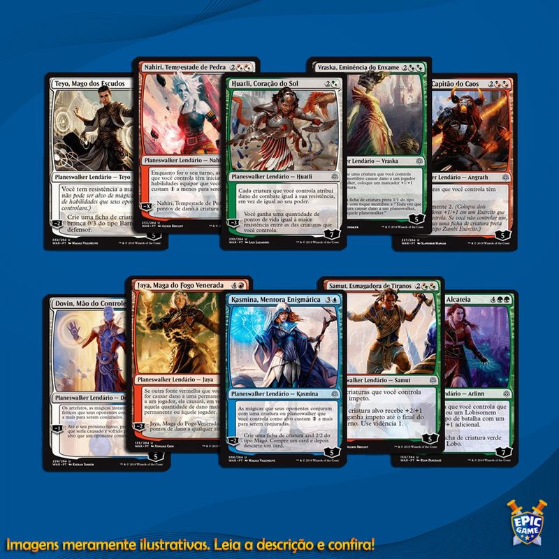 O idioma varia de português e inglês, e pode ter até 2 repetições por carta. A carta de Planeswalker pode ser multicolorida.