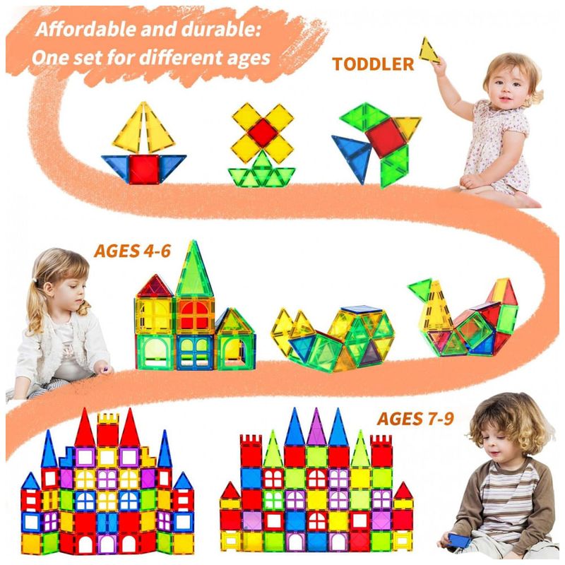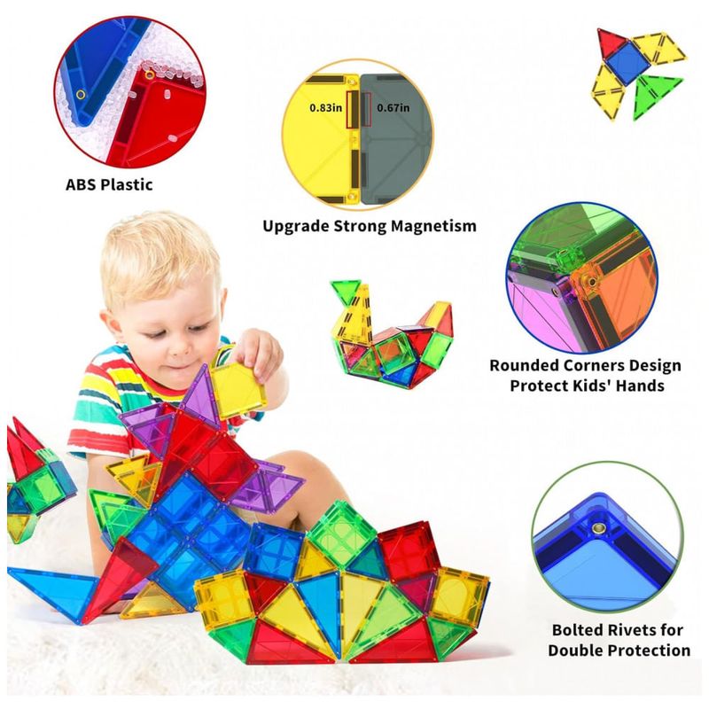 Alta qualidade e Feito de plástico ABS não tóxico e durável. Design de borda redonda sem nitidez, não se preocupe em machucar as mãozinhas do seu filho. Os ímãs são fortes o suficiente para suportar castelos altos. As diferentes formas permitem a máxima criatividade e apelam a uma vasta gama de faixas etárias.