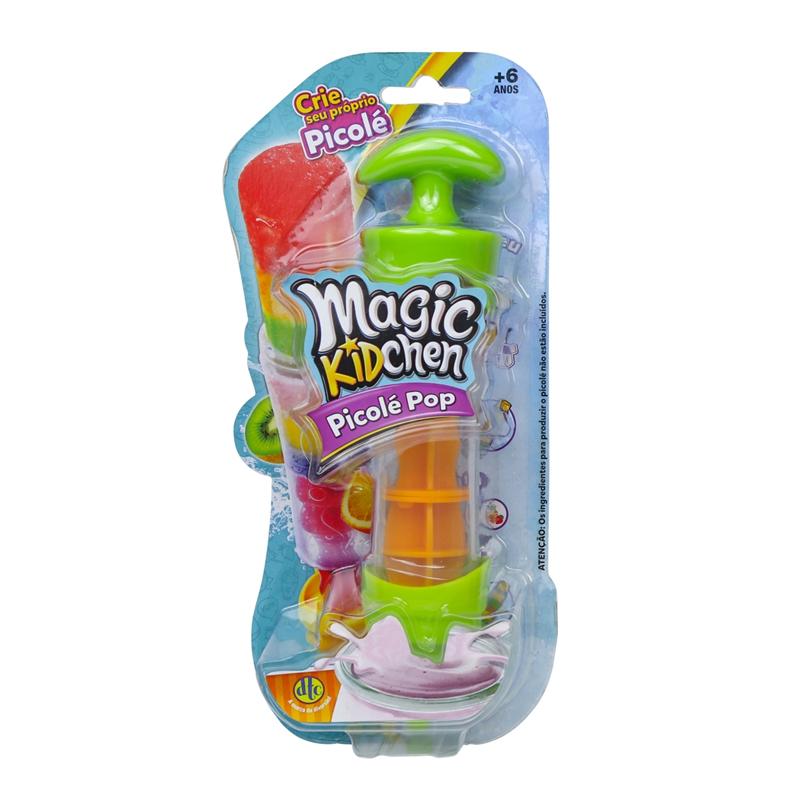 Picolé Pop Magic Kidchen - crie seu próprio picolé!!! Prepare com iogurte, suco ou frutas! Por exemplo: corte as frutas com o próprio Picolé Pop, em várias camadas seguidas, congele e aguarde para saborear. Você pode fazer com suco ou iogurte, puxando o aplicador e congelando até ficar sólido. Retire o aplicador e tome o seu refrescante picolé. Medidas aproximadas do produto: 21 cm de comprimento x 4 cm de diâmetro. Faixa etária indicada: a partir de 6 anos de idade. Marca: DTC.