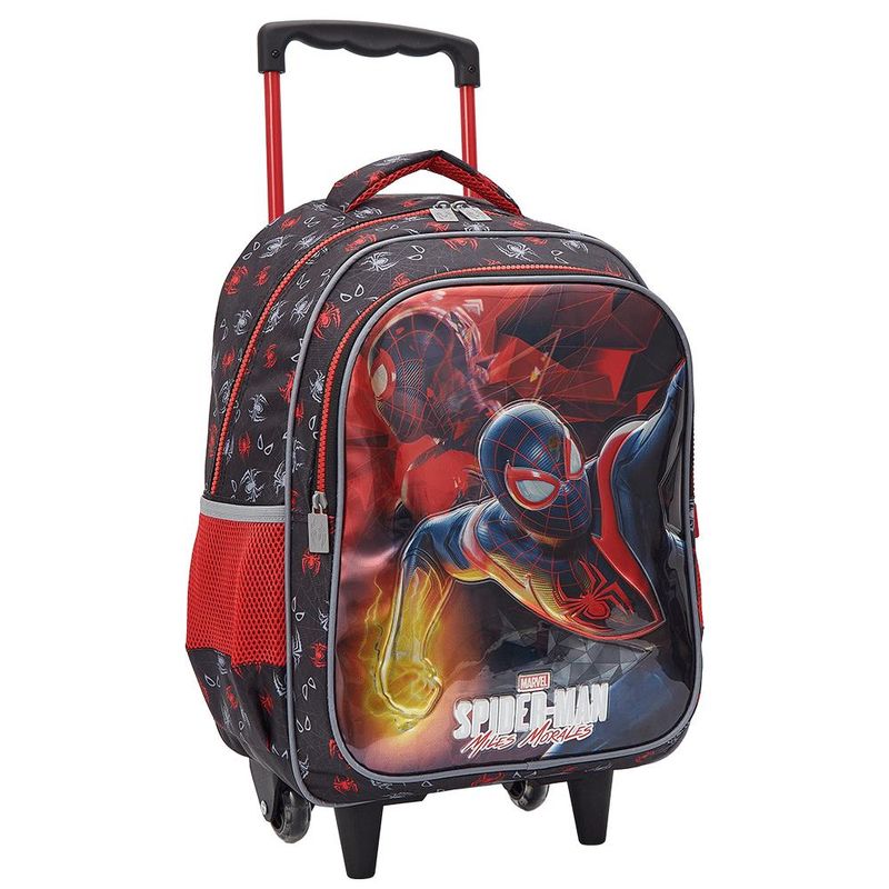 Mala Com Rodas 16 - Produzida em poliester 420D estampado com frente em PVC metalizado vincado, possui 2 bolsos laterais em mesh e alça de mão em 420 D com espuma. Com um compartimento amplo e um bolso frontal com puxadores em metal personalizados. Carrinho com hastes achatadas e rodinhas de gel. Piping forrado e zipper tratorado.