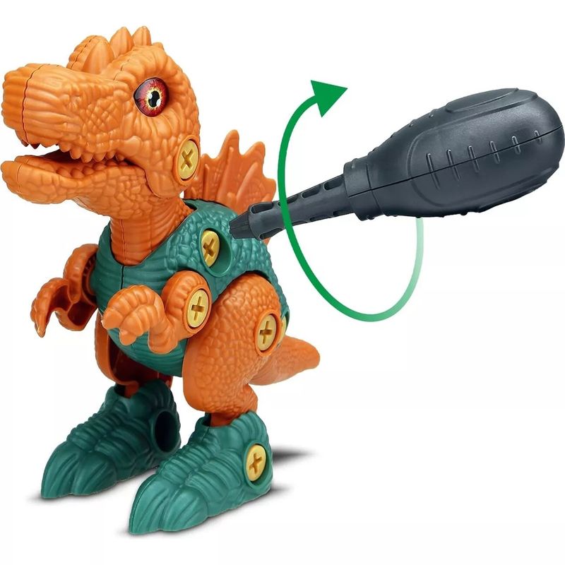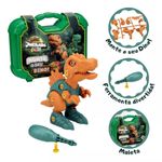 O dinossauro é totalmente articulado, permitindo que as crianças criem diferentes poses e cenários. A maleta tem dimensões aproximadas de 23cm x 8cm x 26cm, perfeita para guardar todas as peças e a ferramenta incluída.