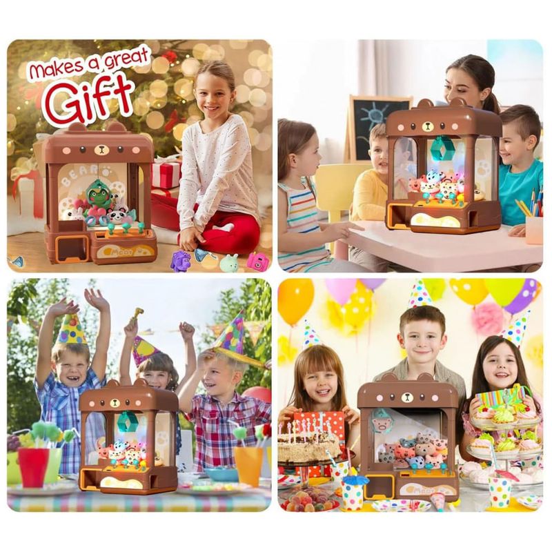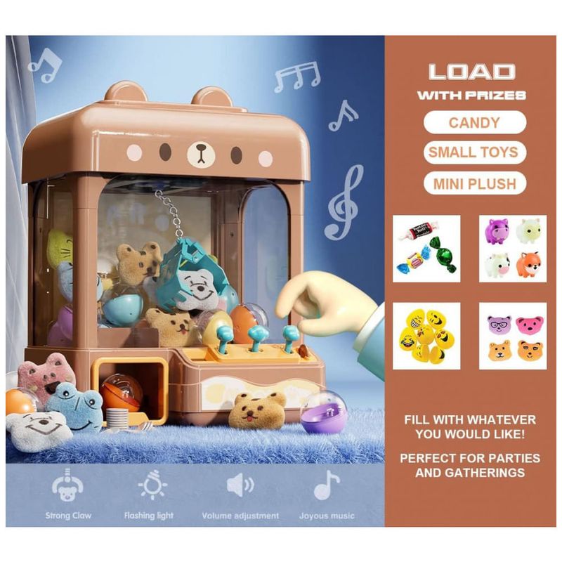 Com dimensões generosas, a máquina conta com um compartimento traseiro espaçoso que permite recarregar facilmente prêmios variados, como mini brinquedos, cápsulas de surpresas, doces e pequenas pelúcias, oferecendo flexibilidade para diferentes tipos de entretenimento. O temporizador de 60 segundos transforma cada rodada em um desafio divertido, acelerando a música nos últimos 10 segundos para aumentar a emoção. Além disso, a máquina possui luzes LED piscantes e músicas estilo arcade, com volume ajustável ou função mudo, permitindo a personalização da experiência sonora.