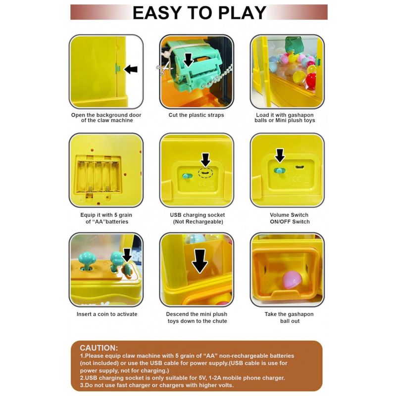 Conteúdo da embalagem: 1 Máquina de Garra, 1 cabo USB, 16 fichas, 20 bolas de plástico, 10 mini bonecos, 1 manual do usuário