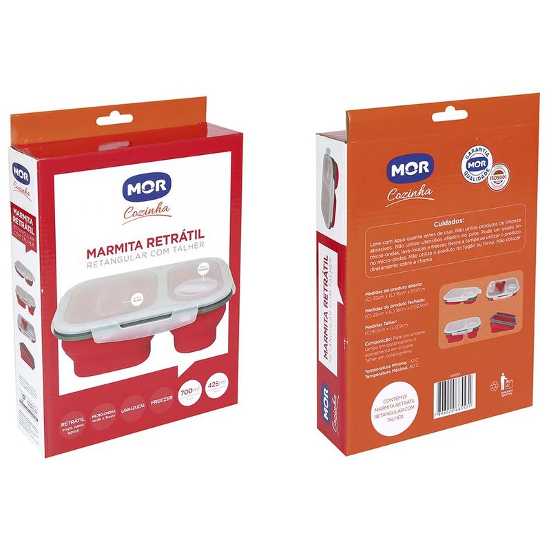 A Marmita Retrátil Retangular da Mor veio para incentivar uma alimentação mais saudável. Resistente e super prática, possui dois compartimentos para organizar as porções de alimentos de acordo com a sua necessidade. O menor espaço possui capacidade para 425ml e o maior 700ml. Por ser retrátil, a marmita ocupa pouco espaço na hora de guardar. Pode ser levada ao micro-ondas, exceto a tampa, para que você desfrute de sua comida sempre quentinha e saborosa. Acompanha um garfo e uma colher dobráveis que vem acoplados à tampa, além de um espaço que serve para acomodar seu tempero favorito. Produzida com materiais de alta qualidade que garantem durabilidade ao produto e fácil manuseio, essa marmita vai acompanhar você por muitas refeições!