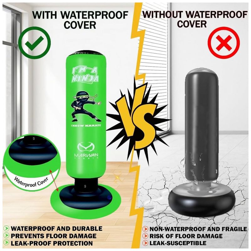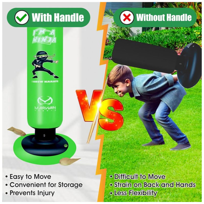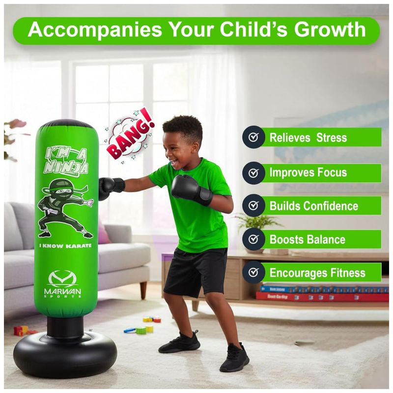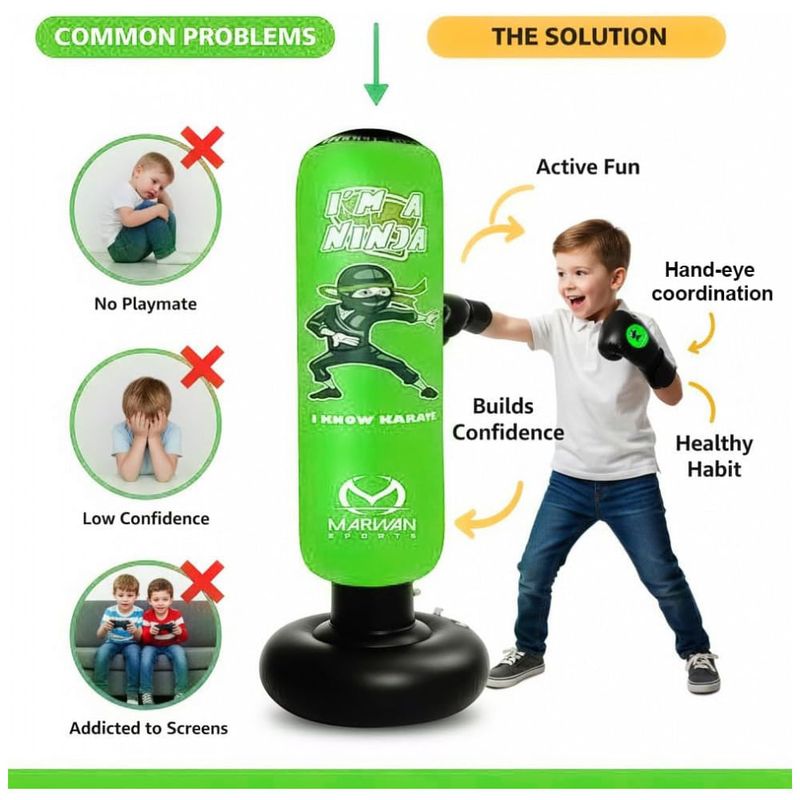 Desperte o ninja que existe em seu filho com o conjunto de saco de pancadas inflável Marwan Sports, o brinquedo esportivo definitivo para crianças ativas! Ideal para meninos e meninas de 4 a 12 anos, este saco de pancadas divertido e interativo promove o desenvolvimento da concentração, coordenação, força e autoestima, tudo isso enquanto mantém as crianças longe das telas e cheias de energia. Com 160 cm de altura e 61 cm de largura, possui tamanho perfeito para crianças, garantindo segurança e conforto durante o uso. Construído em PVC resistente de 0,5 mm, o saco é testado para suportar até 10.000 golpes sem apresentar vazamentos ou perda de ar, oferecendo horas de diversão ininterrupta. Seu design inovador com três câmaras de ar proporciona um retorno rápido a cada golpe, incentivando a prática contínua dos movimentos e o desenvolvimento da agilidade. A base mais larga oferece estabilidade extra, mantendo o saco firme mesmo diante de socos e chutes potentes. Este conjunto completo inclui luvas de boxe de 170g que se ajustam perfeitamente às mãos das crianças, bomba de ar para enchimento rápido e fácil, além de capa inferior e funil para montagem sem complicações. Perfeito para crianças apaixonadas por esportes como boxe, karatê, taekwondo, MMA e outras artes marciais, esse saco ajuda no aprendizado da autodefesa, fortalecimento muscular e diversão saudável tanto em ambientes internos quanto externos. Ao adquirir este produto, você também estará apoiando projetos de conscientização sobre o autismo, pois parte das vendas é destinada a iniciativas de suporte a essa causa importante. Proporcione ao seu filho uma maneira divertida e saudável de liberar energia, melhorar habilidades motoras e aumentar a confiança com o saco de pancadas inflável Marwan Sports – o presente ideal para qualquer ocasião especial!