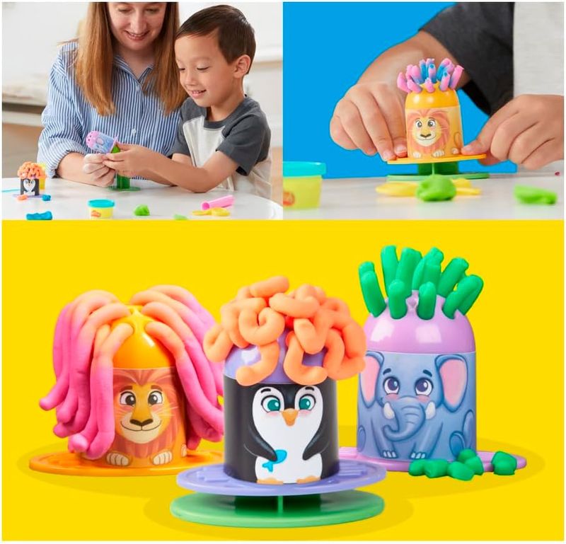 Muita criatividade com o kit Play-Doh Animais com estilo! Basta encher os animais com as cores Play-Doh e apertar para ver os cabelos de Play-Doh crescerem. Este kit para brincar dentro de casa inclui faca, rolo e tesoura para que as crianças brinquem com o cabelo dos animais. Com 113 g de massa de modelar Play-Doh, este kit é uma excelente brinquedo sensorial. Excelente presente para meninos e meninas a partir dos 3 anos que gostam de animais. PLAYDOH e HASBRO e todas as propriedades relacionadas são marcas registadas da Hasbro.