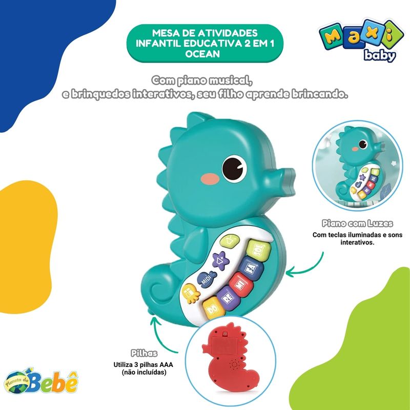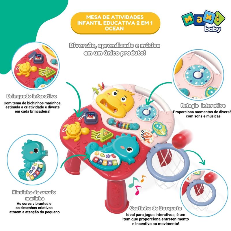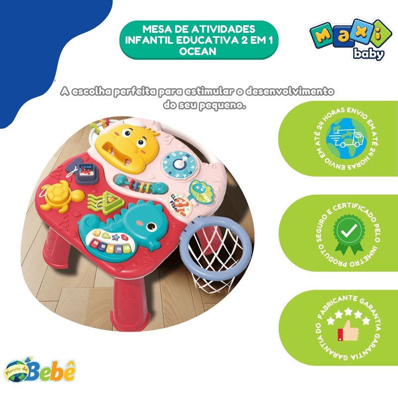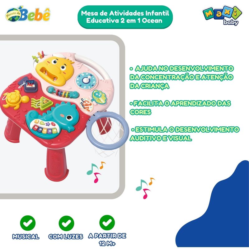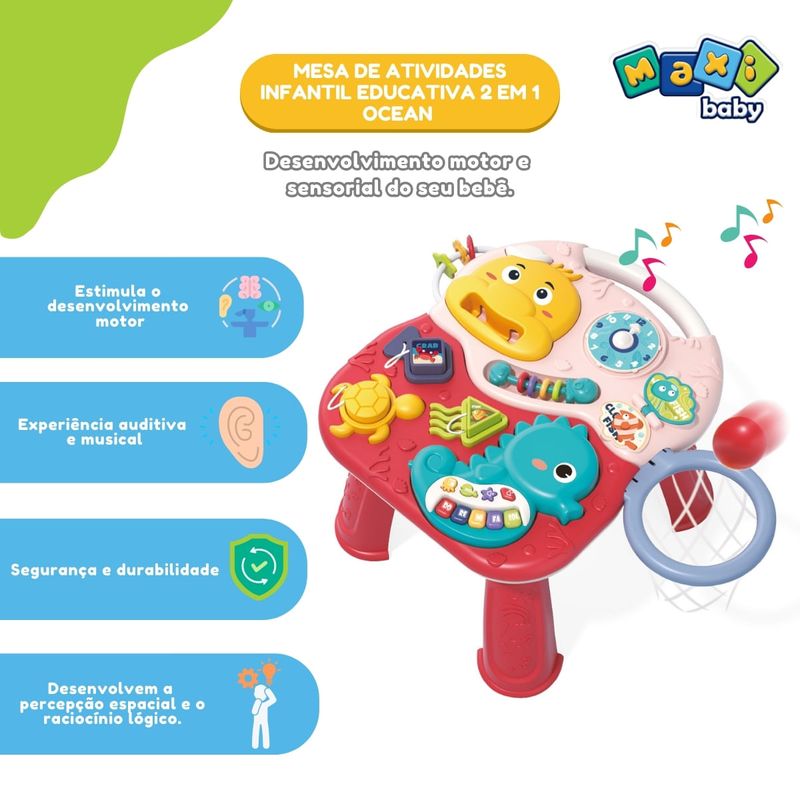 Mesa de Atividades Infantil Educativa 2 em 1 Ocean Maxi Baby Apresentamos o Jogo Mesa Oceano - Navy, uma mesa de jogo multifuncional projetada para acompanhar o crescimento e desenvolvimento do seu bebê desde os 12 meses até os 36 meses. Com dimensões de 33,5 x 39 x 23 cm, este produto é ideal para proporcionar um ambiente de aprendizado e diversão seguro e interativo. O Jogo Mesa Oceano oferece diversas atividades que estimulam a educação precoce e o desenvolvimento cerebral, permitindo que o bebê aprenda enquanto se diverte. Equipado com uma função 2 em 1, ele possibilita diferentes formas de brincar, como atirar a bola, promovendo a imaginação espacial e a cognição de cores e formas. Além disso, possui um brinquedo que toca música, proporcionando uma experiência auditiva estimulante. Este brinquedo também promove a interação pai-filho, tornando cada momento de brincadeira uma oportunidade para fortalecer os laços familiares e treinar os sentidos do bebê. Embalado em uma caixa de cores vibrantes, o Jogo Mesa Oceano é um presente perfeito para qualquer ocasião. Invista no crescimento e desenvolvimento saudável do seu bebê com o Jogo Mesa Oceano - Navy, onde a diversão e o aprendizado caminham juntos. Principais características:
