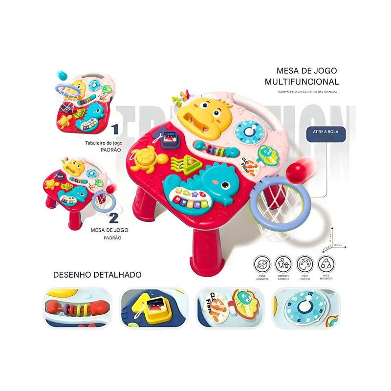 - Versatilidade: Mesa de jogo multifuncional projetada para acompanhar o crescimento e desenvolvimento do bebê.