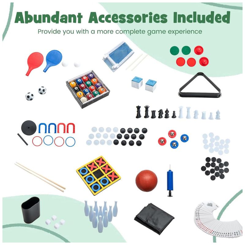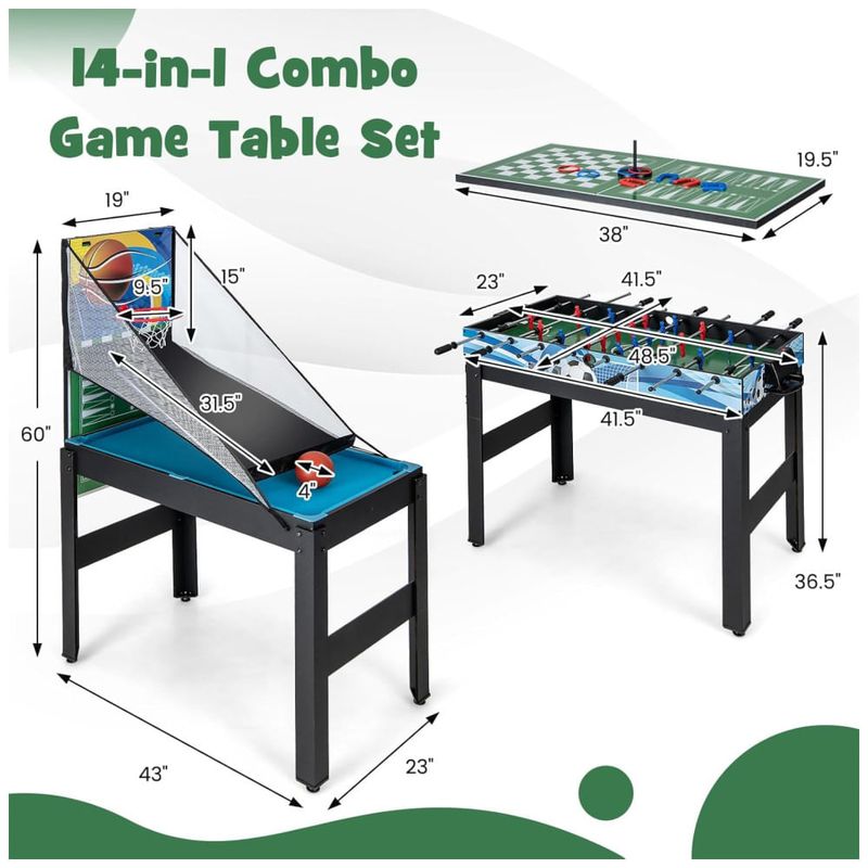O pacote inclui um conjunto de jogos 14 em 1 completo e instruções detalhadas para montagem e uso, garantindo que você possa aproveitar ao máximo todas as opções de diversão que esta mesa multijogo tem a oferecer. Prepare-se para horas ininterruptas de diversão com o conjunto de mesa de jogo Giantex 14 em 1!